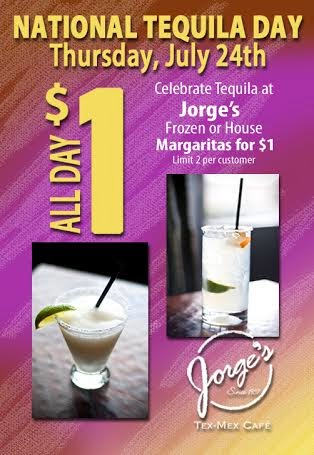 Give up? It's National Tequila Day... and what better way to celebrate than at Jorge's Tex-Mex Cafe. All day today you can enjoy $1 frozen or house margaritas. Grab your friends and head down to One Arts Plaza to rediscover why Jorge's is voted Dallas' best margaritas!